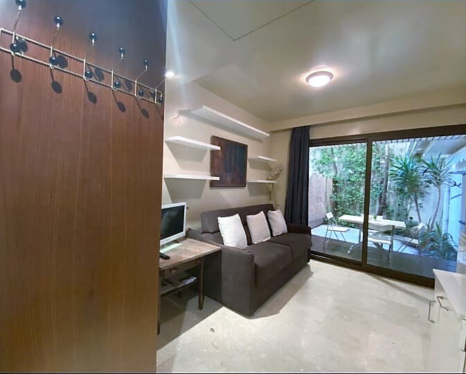 il est composé d'une cuisine américaine équipée, d'une salle de bain en marbre et d'une piéce principale avec canapé-lit.